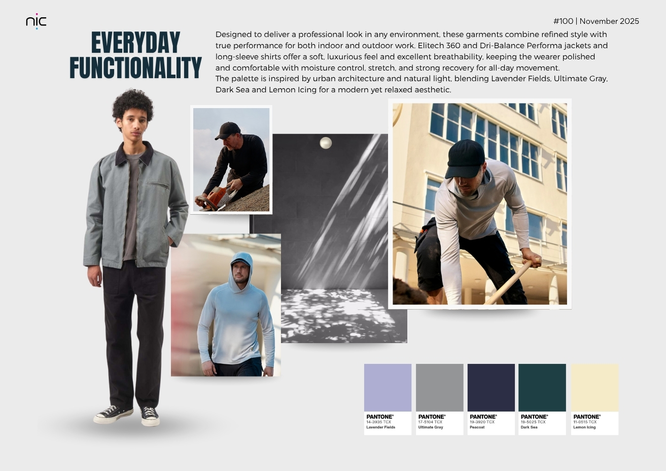 Designed to deliver a professional look in any environment, these garments combine refined style with true performance for both indoor and outdoor work. Elitech 360 and Dri-Balance Performa jackets and long-sleeve shirts offer a soft, luxurious feel and excellent breathability, keeping the wearer polished and comfortable with moisture control, stretch, and strong recovery for all-day movement. The palette is inspired by urban architecture and natural light, blending Lavender Fields, Ultimate Gray, Dark Sea and Lemon Icing for a modern yet relaxed aesthetic.