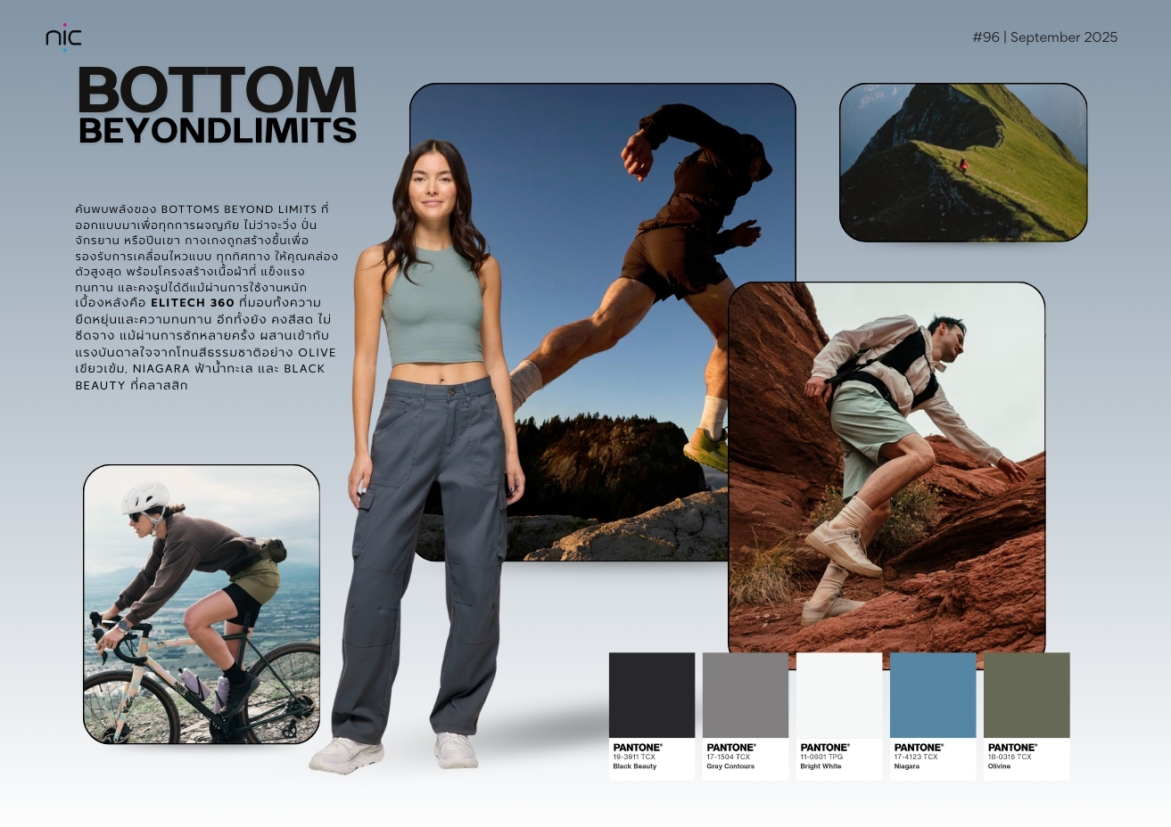 ค้นพบพลังของ Bottoms Beyond Limits ที่ออกแบบมาเพื่อทุกการผจญภัย ไม่ว่าจะวิ่ง ปั่นจักรยาน หรือปีนเขา กางเกงถูกสร้างขึ้นเพื่อรองรับการเคลื่อนไหวแบบ ทุกทิศทาง ให้คุณคล่องตัวสูงสุด พร้อมโครงสร้างเนื้อผ้าที่ แข็งแรง ทนทาน และคงรูปได้ดีแม้ผ่านการใช้งานหนัก เบื้องหลังคือ Elitech 360 ที่มอบทั้งความยืดหยุ่นและความทนทาน อีกทั้งยัง คงสีสด ไม่ซีดจาง แม้ผ่านการซักหลายครั้ง ผสานเข้ากับแรงบันดาลใจจากโทนสีธรรมชาติอย่าง Olive เขียวเข้ม, Niagara ฟ้าน้ำทะเล และ Black Beauty ที่คลาสสิก
